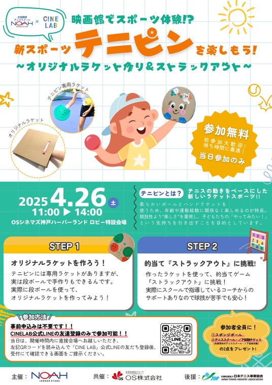 インドアテニス&バドミントンスクールを全国に35校展開する業界大手のノアインドアステージ株式会社(代表取締役社長:大西雅之、本社:姫路市東山524)は、神戸市でシネマコンプレックス「OSシネマズ」を経営するオーエス株式会社(本社:大阪市北区、代表取締役:金谷伸雄)とコラボレーションし、オーエス株式会社が展開する「CINE LAB(シネラボ)」の一環として、「新スポーツ『テニピン』を楽しもう!~オリジナルラケット作り&ストラックアウト~」を、4月26日(土)にOSシネマズ神戸ハーバーランドのロビーにて開催します。