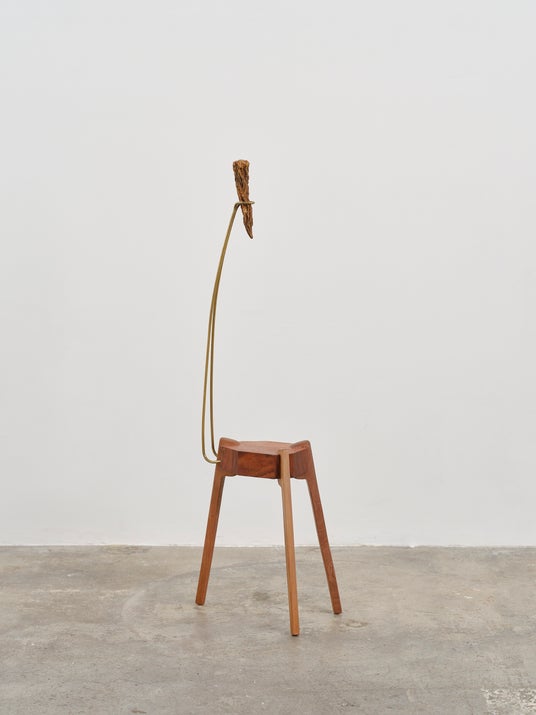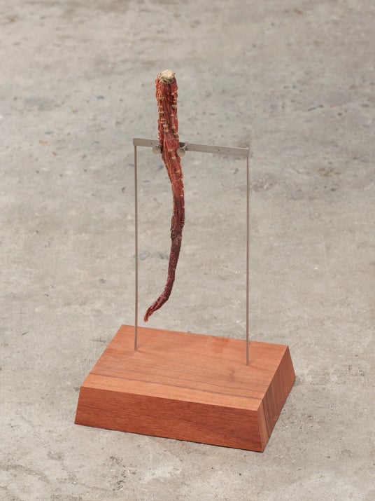 代表作:「Cast and Rot」シリーズ より "Cast and Rot No.42" ニンジン、Hi-Mic 1080、リグロイン、石灰硫黄合剤、木、真鍮 / H685xW230xD140mm / 2023 Photo by Ichiro Mishima, Courtesy of LEESAYA