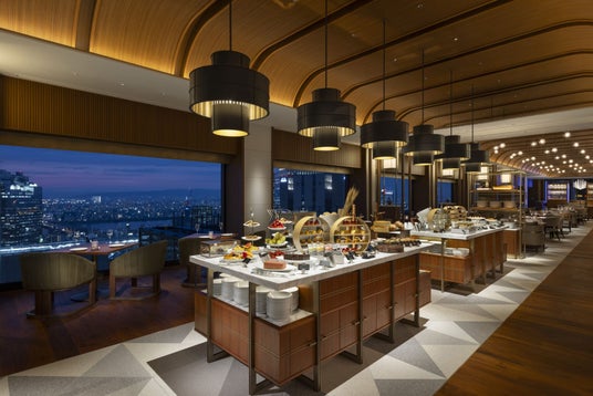 車窓を思わせる窓から広がる大阪の絶景とともに、ビュッフェを満喫