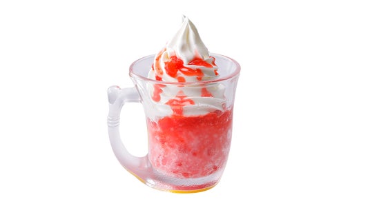 細かく削った氷にイチゴの果肉を混ぜ、トッピングに北海道ソフトクリームと果肉入りのイチゴソースをたっぷりとかけた、びっくりドンキーオリジナルのかき氷です。
