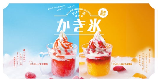 「暑くなるこれからの時期、お客様にひんやり涼んでいただきたい」という想いを込めて、果肉入りのイチゴソースをたっぷりとかけた「ドンキーイチゴ雪氷」と、マンゴー氷に果肉入りのドラゴンフルーツソースをたっぷりとかけた「ドンキートロピカル雪氷」の2種が登場します。