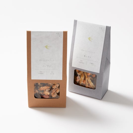 やなぎのにわ「京おこしグラノーラ」:京都・上七軒に工房を構える人気菓子店の、ナチュラルな食材のみで作られた「おこし」のような和のグラノーラ。プレーンと海苔醤油味のセット。