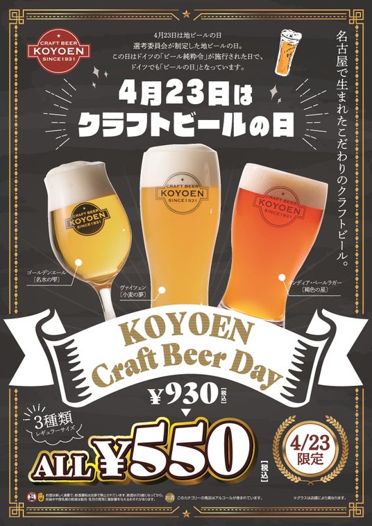 この日を記念して、"浩養園クラフトビールの発信基地"として名古屋市で展開する「CRAFT BEER KOYOEN」2店舗と浩養園クラフトビールの醸造所がある「浩養園BREWERY アトリウムホール」の計3店舗で、3種類の浩養園クラフトビール(グラスサイズ)を、4月23日(水)当日限定で通常価格930円(税込)~のところ特別価格550円(税込)で提供します。