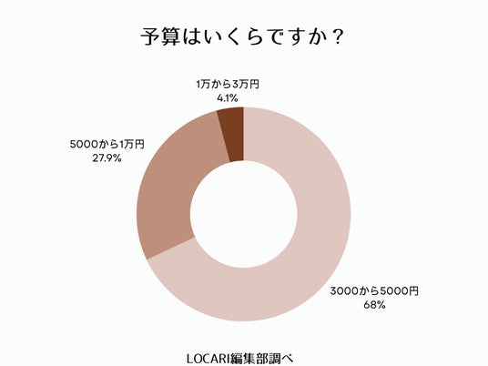 最も多かったのは「3,000~5,000円」で、68%の人がこの価格帯を選んでいます。次いで多かったのは「5,000~1万円」(27.9%)で、予算を少し高めに設定することで選択肢を広げたいと考える人も一定数存在しました。また、4.1%の人は「1万~3万円」と回答しています。(n=203)