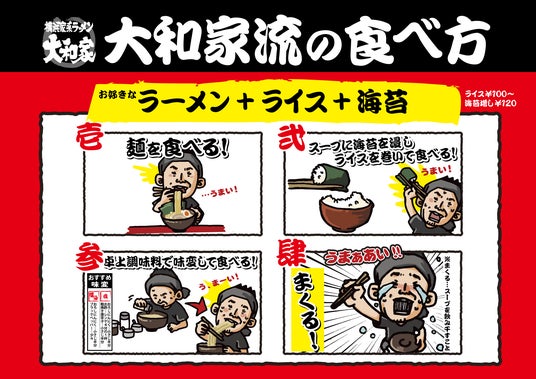 なんと150円でライス食べ放題!!!!大和家流おススメの食べ方はラーメン+ライス+海苔のコンビネーション。存分に楽しんでいただけるよう半田大和家ではライス食べ放題がなんと150円。スープにひたした海苔でライスを巻いて食べるのも、ライスをスープに入れて雑炊風にしても、ライスがあれば大和家のスープを最後の一滴まで堪能できちゃいます!