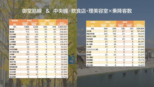 大阪を南北に貫く大動脈「御堂筋線」。そして、万博開催で注目される中央線。この2つの路線にフォーカスをあて、2023年~2024年の飲食店と理美容室の開業データ(駅を中心とした半径1km圏)を、各駅の乗降客数と照らし合わせ、「人の流れ」と「開業意欲」の関係性を分析しました。