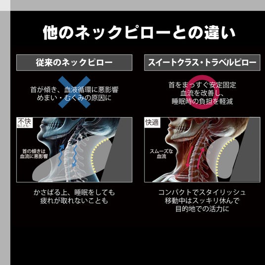 従来のネックピローとは異なり、使用中に首がブレにくい構造を採用。首と背骨の自然なアライメントを保つことで、血流や呼吸を妨げず、移動中のむくみや疲労、頭痛を和らげます。