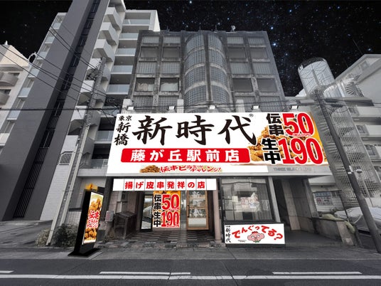 新時代は「揚げ皮串発祥」のお店であり、名物の『伝串』は、特許庁から認められる唯一無二の大ヒット商品です。並んででも「伝串」を体験されたいというお客様が多く、連日行列ができる大人気の居酒屋です。1000の街を元気にするため、全国の街を一つずつ元気にしており、今回は名古屋・藤が丘に初上陸。名古屋だけでなく、愛知全体を元気にします。オープン前から大行列ができること間違いなしです。