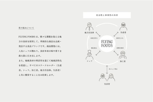FLYING FOODSは、日本に眠る魅力的な食材や技術と、確かな腕を持つシェフをマッチングすることで、今までにない体験や感動を生む商品を展開予定です。