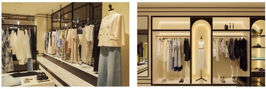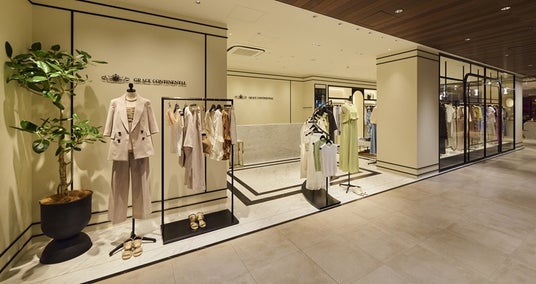 「GRACE CONTINENTAL ONE FUKUOKA BLDG.店」は、曲線を活かした壁面や幾何学模様の大理石什器などを用い細部にまでこだわった、モノトーンのシックなデザインにアートピースが映える空間です。幅広い世代の天神ワーカーや、韓国・台湾・中国を中心としたインバウンド観光客に向け、カジュアルからドレスラインまでフルラインアップし、ブランドの魅力を発信します。
