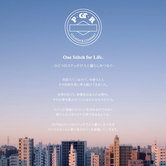 POTRは、「One stitch for Life. -ひとつのステッチが人と暮らしをつなぐ-」をコンセプトに、吉田カバンの長年にわたるモノづくりの経験をいかした、さまざまなライフスタイルに寄り添うプロダクトを展開するブランドです。