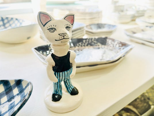 玉峰陶園(玉峰窯)には「猫監督」として工房を案内し、焼き物作りを紹介する黒猫のネルソン君という猫がいます。猫作品がずらりと並ぶ工房には美しい釉薬と猫への愛があふれた作品が並び、猫好きなら一目ぼれすること間違いなし。