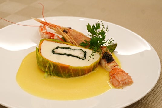 ■三陸産地魚(インディーズフィッシュ)の温かいテリーヌとラングスティーヌ サフラン風味のバンブランソース キャビアとアスパラガス