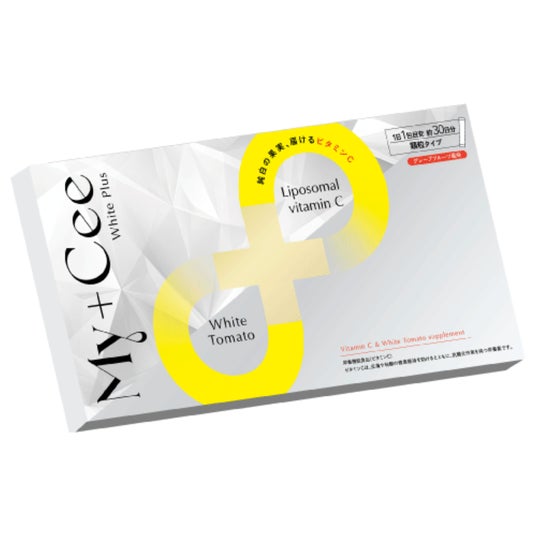 『My+Cee WHITE PLUS』は、特別なホワイトトマトから抽出した無色カロテノイドや各種ビタミンなどの美容成分を配合した顆粒状サプリメントです。水なしで飲めるグレープフルーツ味で手軽に続けられることから、美容意識の高いユーザーを中心に支持されています。