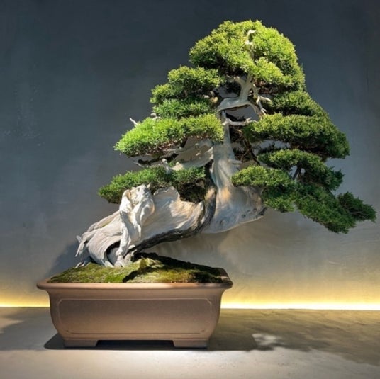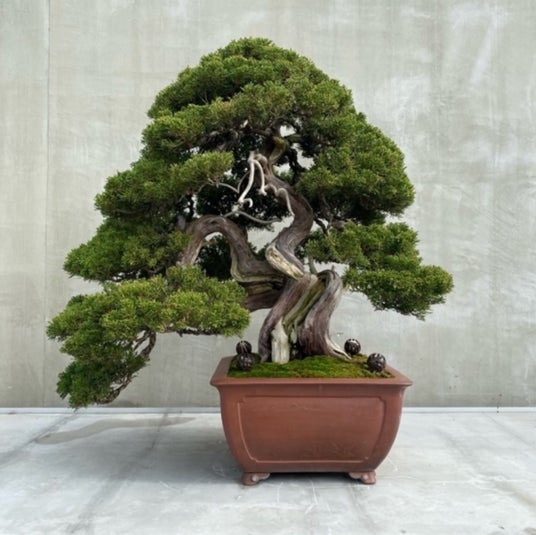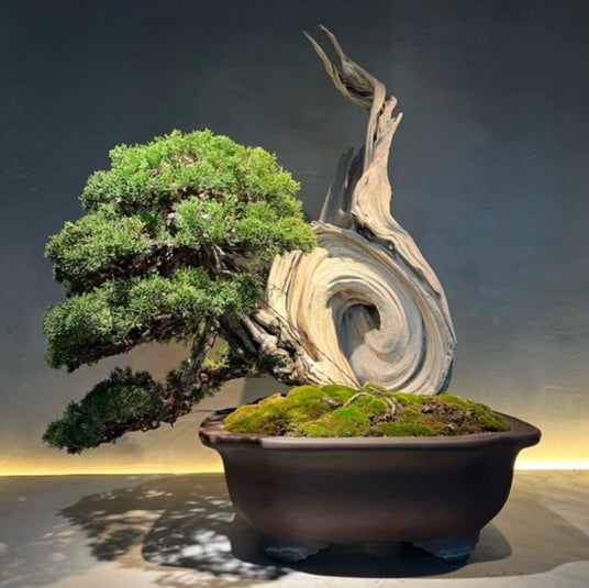 『真柏』渦を巻くような舎利が特徴的な唯一無二の作品。煙を思わせる立ち上がり方をした天神も非常に魅力的。松柏類と人気が二分される代表的な世種。白骨のような舎利(シャリ)、神(ジン)が特徴。生(水吸い)と死(舎利、神)のコントラストを表現する樹種。