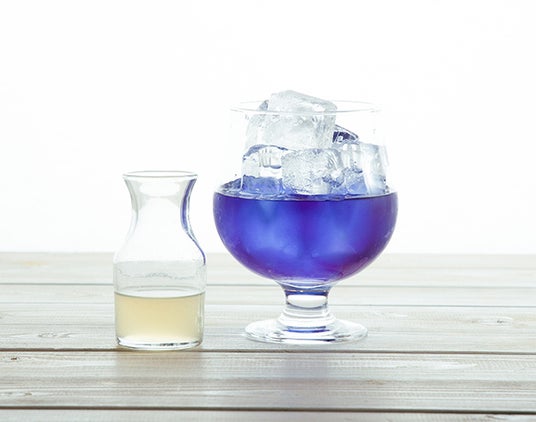 すっきりした風味のティーレモネード。海のようなコバルトブルーですが、レモンシロップを入れると紫のようなカラーに変化します。