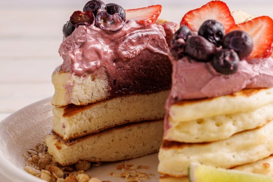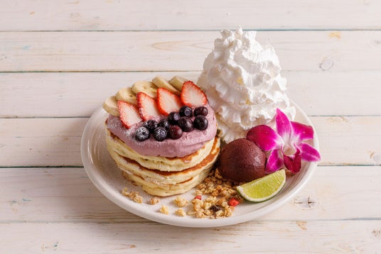 3枚重ねたパンケーキ生地の上には、アサイーとヨーグルトを組み合わせた特製のクリームがボリューミーに重なり、いちご・バナナなどのフレッシュフルーツをトッピング。
