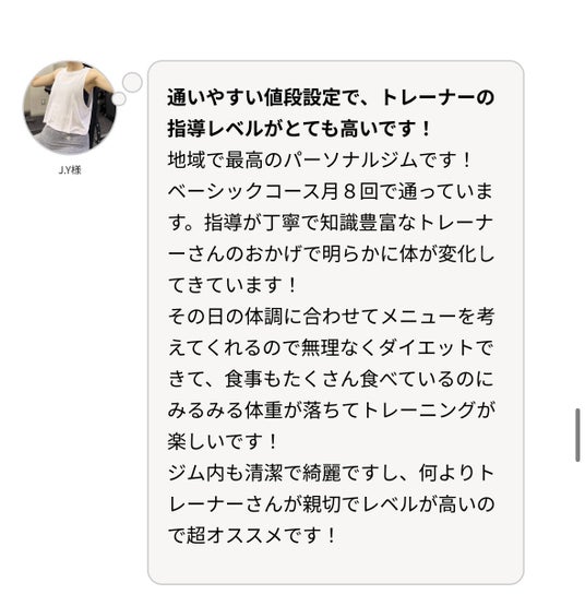 トレーナーさんはとても明るくていつも励ましてくれるので諦めずにここまで来れました。何よりも楽しく通えています。