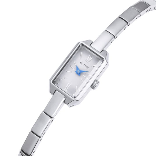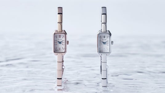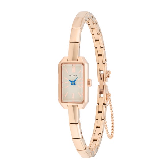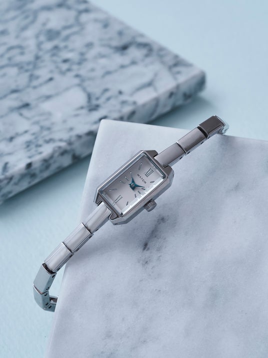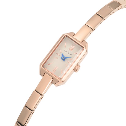 職人の手によって細部まで丁寧に仕上げられ、時代を超えて愛される一本となるように仕立てました。縦23mm×横13mmのコンパクトなレクタングルケースは、ローズゴールドとシルバーの2種類をラインナップ。それぞれケース同色のメタルベルトを備え、手首に馴染むように設計されています。さらに、バックル部分には細身のチェーンが付属し、ジュエリーのように楽しめる仕様に。シンプルながらも、手元に洗練された輝きを添えるデザインとなっています。都会の喧騒から一歩離れ、静かに自分と向き合う時間を持ちたい。そんな大人の女性に寄り添う時計です。オンタイムには端正な品格を添え、オフタイムには優雅なリラックス感を演出します。移ろいゆく時間の美しさを、手元でそっと感じてください。