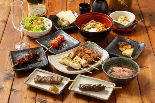 前菜、サラダ、季節逸品料理、厳選焼き鳥串四本、旬の野菜串二本、特級串一本、ジビエ串二本、箸休め、荒木山名物の逸品付け、食事(ご飯orそば)季節の甘味、ワンドリンクサービス付き ※甘味・野菜串の内容は変更となる場合が