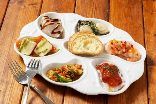 牡蠣のマリネ、桜海老と芽キャベツのマリネ、タコのアラビアータ、鮮魚とキノコのマリネ、エビと彩り野菜のマリネ、スモークサーモンとカマンベール
