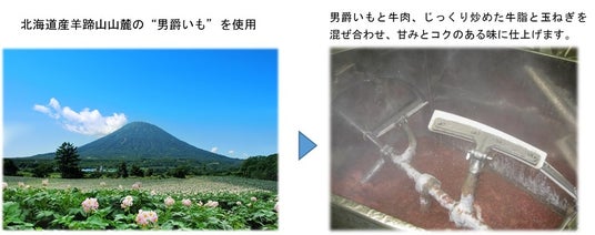 北海道産羊蹄山山麓は、男爵いもの生産地として有名です。その産地で収穫された男爵いもに、牛肉とコクと旨みを出すためにじっくりと炒めた牛脂と玉ねぎを加えています。男爵いものほっこり感とコクと旨みの増した牛肉タネが調和し、甘みとコクのある味に仕上がっています。