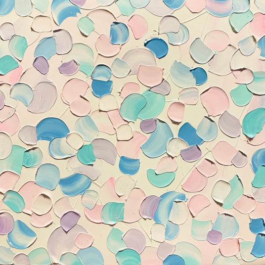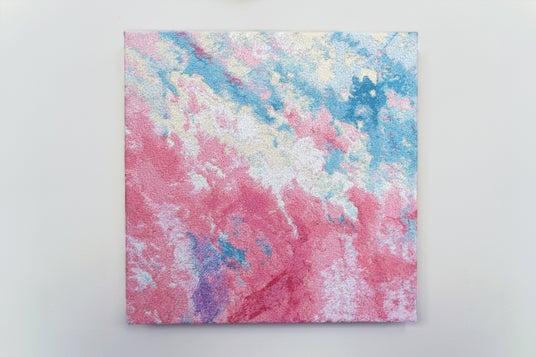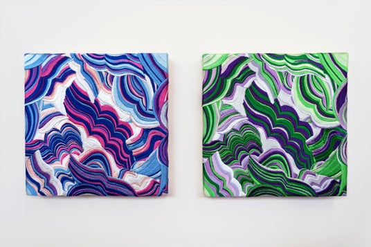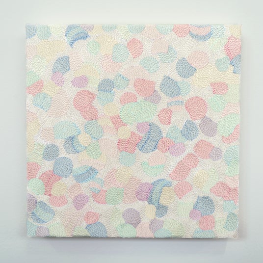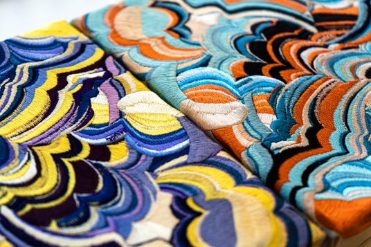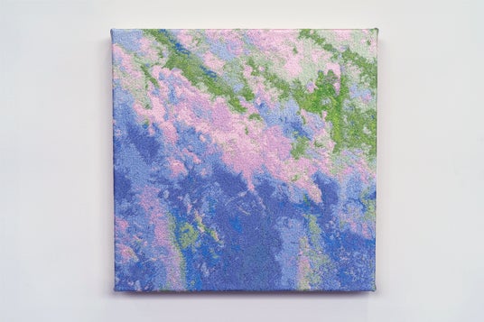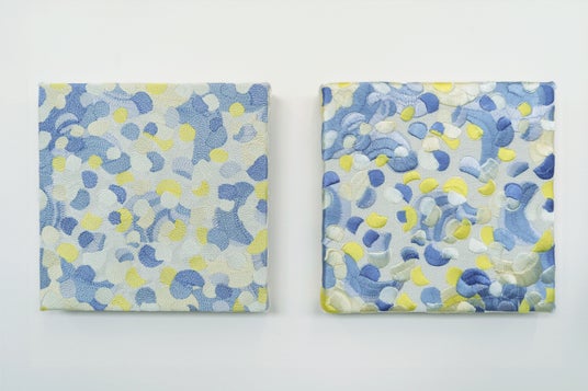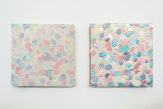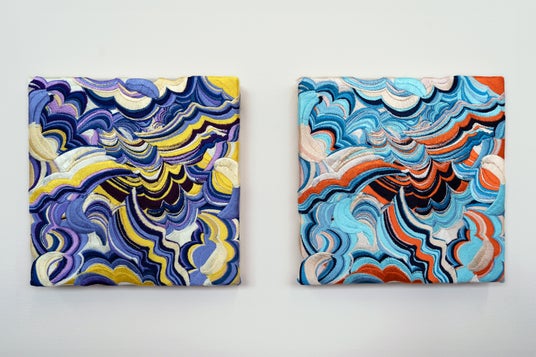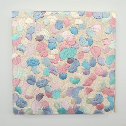 岡村氏は白を用いて色彩を中和した油絵具の混色で作品をつくり、日本国内のみならず海外にも多数のファンを抱える国際的に活躍をしている抽象画家です。今回、岡村氏の抽象画に現わされる大胆な色彩感とその奥行き、有機的なストロークから感じられる独特な筆致を刺繍として再解釈し、刺繍による表現を新たな角度で追求しました。