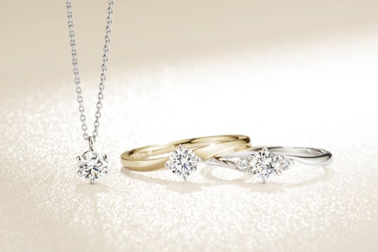 3万個以上の選択肢から選ぶダイヤモンドと多彩なデザインを組み合わせ、理想を形にすることができる「婚約指輪」と「婚約ネックレス」。ダイヤモンドを贈り、デザインは後から選ぶ『ダイヤモンドでプロポーズ』。