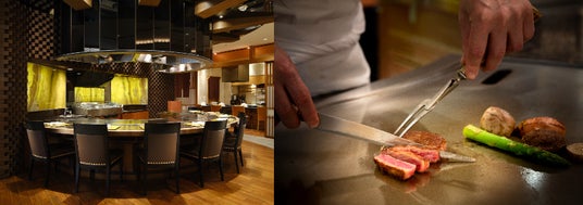 鮨・天麩羅・鉄板焼それぞれの専用カウンターを設けた「羽衣」。熟練職人が、四季折々の日本の美味を奏でます。カウンター席で職人との会話を楽しみながら、お目当ての品を間近に、好きなものを少しずつお愉しみいただけます。また、個室やテーブル席のご用意もございます。