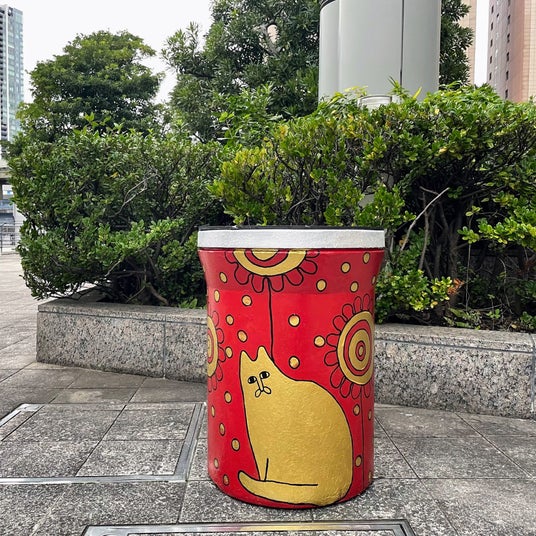 海・公園・まち・人・往来をイメージした5色の背景に描かれた金色のネコには、ダストボックスという気にも留められない存在でも、アートによって気づきや楽しみ・新しい価値を生み出すことが