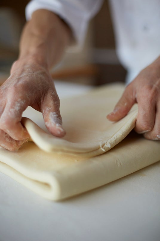 coneri 品川のスティックパイに使用するのは、国産の小麦粉や大豆を原料とした厳選された「酵豆粉」を独自にブレンドした"こねり粉"。パイ生地作りの要の「こねる」「折る」「伸ばす」の工程は、熟練のパイ職人による手わざでこそ成せる業。季節・天候・温度・湿度とあらゆる些細な変化も見逃さず、生地の声に耳を傾け会話しながら、約1,000層のパイ生地に仕上げます。