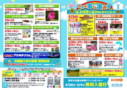 また、海洋博公園では、施設の魅力やイベント情報を掲載した最新号 「美ら海通信5月号」 を発行しました。本号では、GW期間中に開催される各種イベントの詳細もご紹介しています。