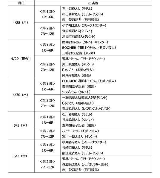 4月28・30日、5月1・2日:14時00分~17時20分、17時25分~21時00分の2部構成