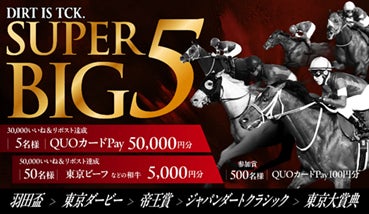 4月29日(祝火)羽田盃(JpnI)を対象に、5大競走に関する「TCK SUPER BIG5 キャンペーン」を実施します。TCK公式Xアカウント(@tck_keiba)をフォローのうえ、キャンペーンポストをリポストまたはいいねするだけで応募は完了。応募していただいた方の中から抽選で500名様にQUOカードPay100円分をプレゼントするほか、「リポスト」と「いいね」の合算値が目標数に到達すると参加者の中から抽選でQUOカードPay 50,000円分など豪華賞品をプレゼントします。