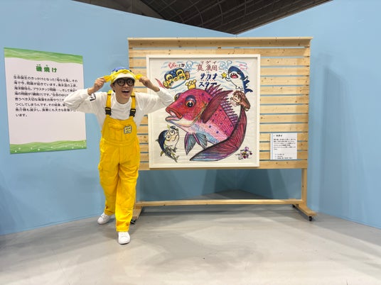 さかなクンが制作したマダイちゃんのイラストの前で「水産王国愛媛の皆様~おまちしておりま~す♪ギョギョっ」とイベントをPR