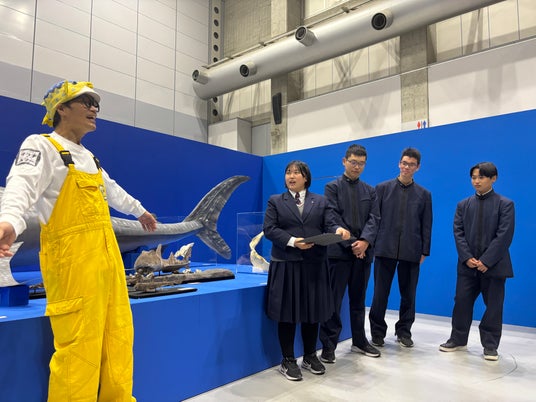 また、TVでメインMCの1人であるさかなクンと海の問題に携わる宇和島水産高校で水産増殖研究部の3年生4名(以下、宇和高生)が展示会を見学しました。