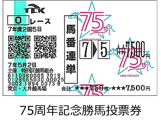 第2回開催期間中(4/28~5/2)は、開場75周年を記念し、大井競馬場内の全投票所で75 周年ロゴがデザインされた馬券を発券します。また、第3回開催以降も一部の投票所で発券し、なくなり次第終了とさせていただきます。