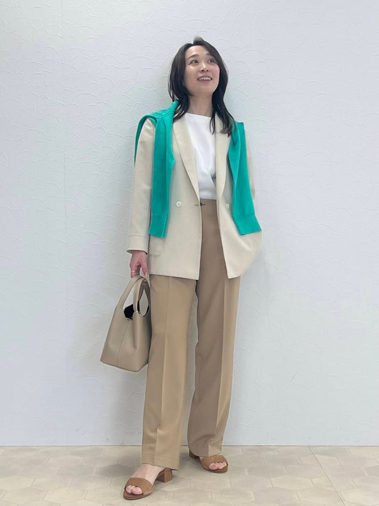 堅い印象に見えがちなジャケットスタイルは、ナチュラルカラーで優しい表情に。パンツはセンタープレス入りのストレートシルエットで、きちんと感がありながらもドライなタッチが汗ばむ季節に嬉しいアイテムです。差し色にしたグリーンのコットンカーディガンは、オフィスでの冷房対策にも。