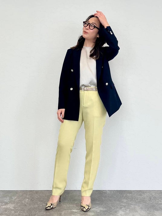 ウォッシャブルブレザーを使ったサマートラッドスタイル。着丈長めのWブレストブレザーは、すっきりとしたテーパードパンツとも好相性です。コントラストの効いたネイビー×イエローで、きちんと感と個性を両立した着こなしに。