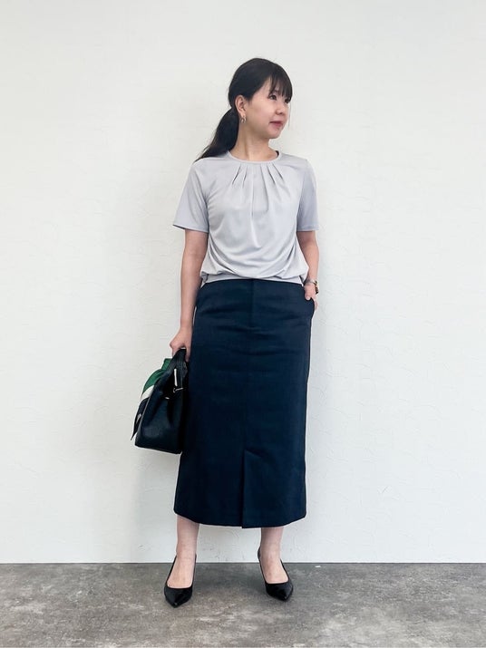 ストレートスカートを合わせて、すっきりとしたIラインシルエットに。足首が覗く長めの丈感が上品な印象です。カットソーは裾アウトでもブラウジングしたような立体感が出るので、カジュアルになりすぎないのがポイント。