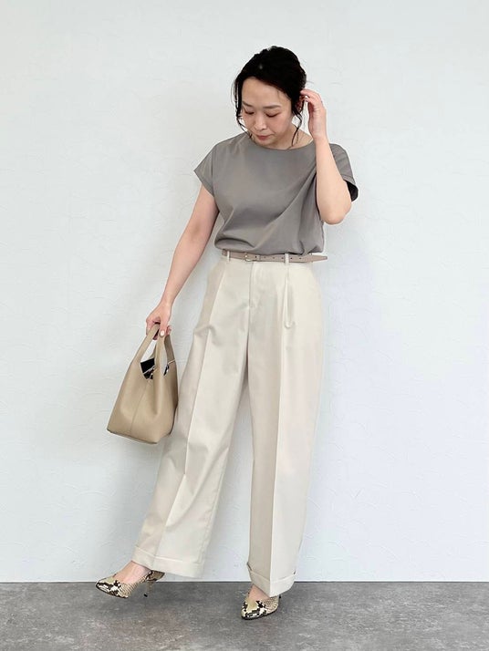 ニュアンスのあるカーキベージュは、1枚でもシックな表情が叶うカラー。程よくリラックスした雰囲気のワイドパンツにレザー小物を合わせれば、スタイリッシュなクールビズコーデが完成します。