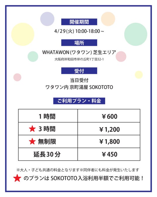 特典:3時間プランまたは無制限プランのご利用で、「京町湯屋SOKOTOTO」の入浴料が半額