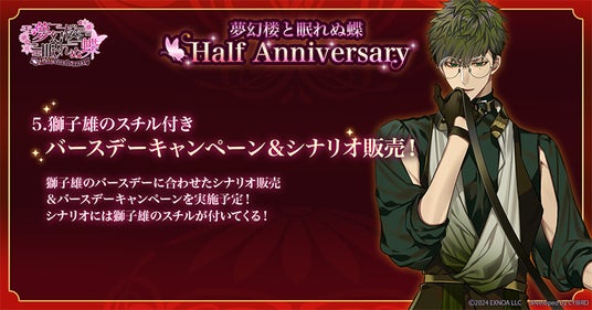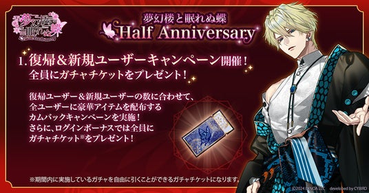 DMM GAMESを運営する合同会社EXNOA(本社:東京都港区、CEO:村中 悠介、URL:https://games.dmm.com/)は、オトナの女性向け恋愛ゲーム「夢幻楼と眠れぬ蝶」にて、2025年5月19日(月)のハーフアニバーサリーを記念したキャンペーンの開催をお知らせいたします。