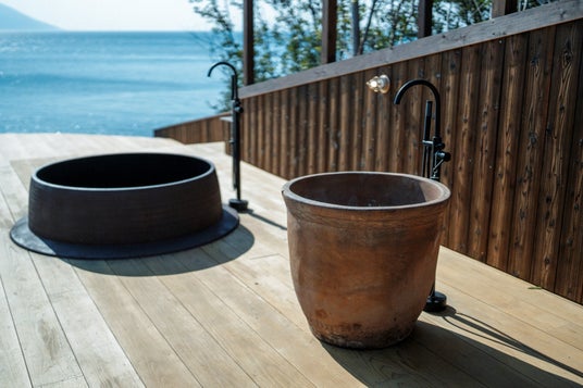 4つの温冷浴(江戸時代に実際使われていた釜風呂を民族資料館より譲り受けました)ができるお風呂と、醤油樽(小豆島で実際使われていたもの)を使った樽サウナ、そして目の前の瀬戸内海、プライベートビーチ。