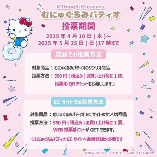 さまざまなキャラクターグッズを企画・販売している株式会社KThingS(東京都中央区)は、CoCoLo新潟 1F 吹き抜け広場「ガタリウム」にて『サンリオキャラクター大賞 POP UP STORE × むにゅぐるみパティオ』を2025年5月1日(木)~2025年5月15日(木)の期間で開催いたします。