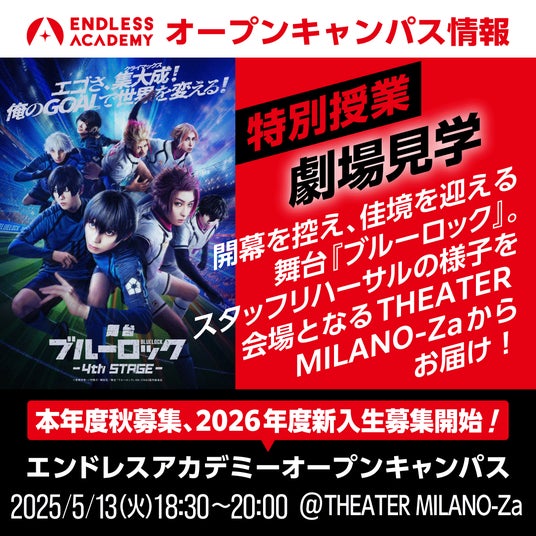 舞台『ブルーロック』4th STAGE期間中には東京公演、大阪公演でそれぞれ劇場でスタッフワークを見学できる総合芸術学校「エンドレス・アカデミー」のオープンキャンパスも実施します。