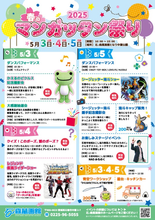 日時:2025年5月3日(金祝)~5月5日(日) 10:00~15:00 【3日間】場所:石ノ森萬画館となり中瀬公園