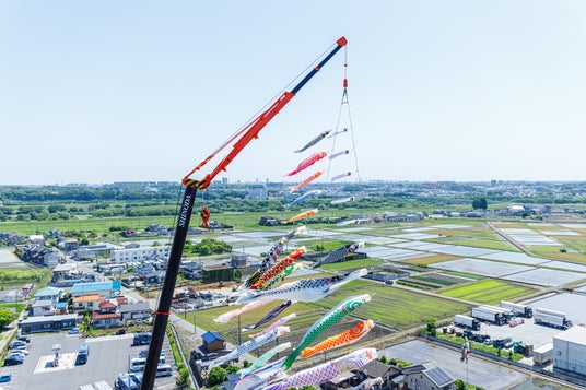 高さ60mのクレーンから見下ろす、鯉のぼりとなまずのぼりの雄大な景色は圧巻です。