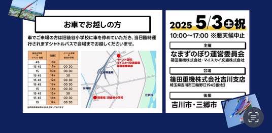 埼玉県を中心にクレーンリース業などを展開する篠田重機株式会社(本社:埼玉県三郷市、代表取締役:篠田壽和)などが主催するイベント「なまずのぼり2025」が、いよいよ2025年5月3日(土)に、埼玉県吉川市にて開催されます。