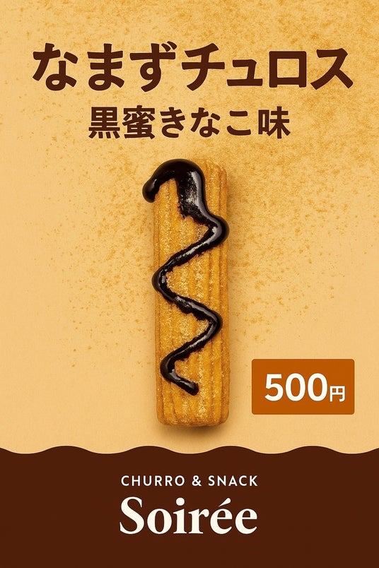 今回のイベント「なまずのぼり2025」に参加させて頂くに際し、「なまずチュロス」を新たに作りました! 1本のチュロスにきな粉フレーバーをまぶし、背びれを黒蜜でイメージしたなまず味(黒蜜きな粉味)をなまずのぼり限定で販売いたします!
